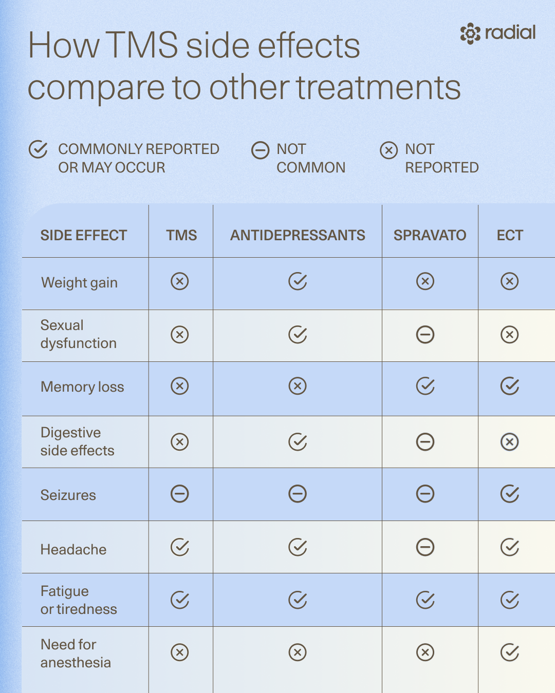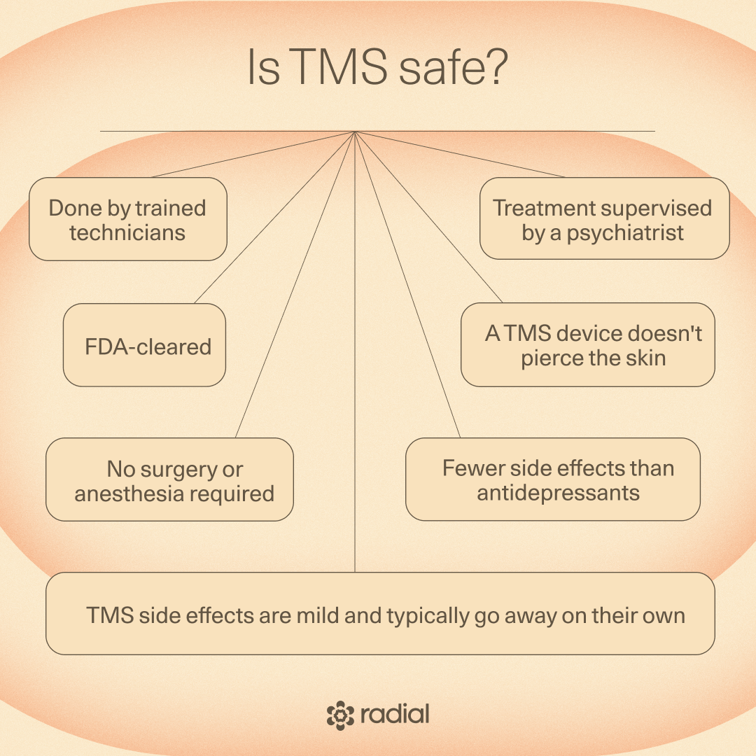 While TMS’ uniqueness causes some to hesitate, it’s a safe, FDA-cleared, non-invasive option. Its effectiveness and minimal side effects speak for themselves, especially compared to other options like antidepressants or ECT. If interested in learning more about TMS, reach out to Radial. We’ll help you find the evidence-backed treatment that works for you.
